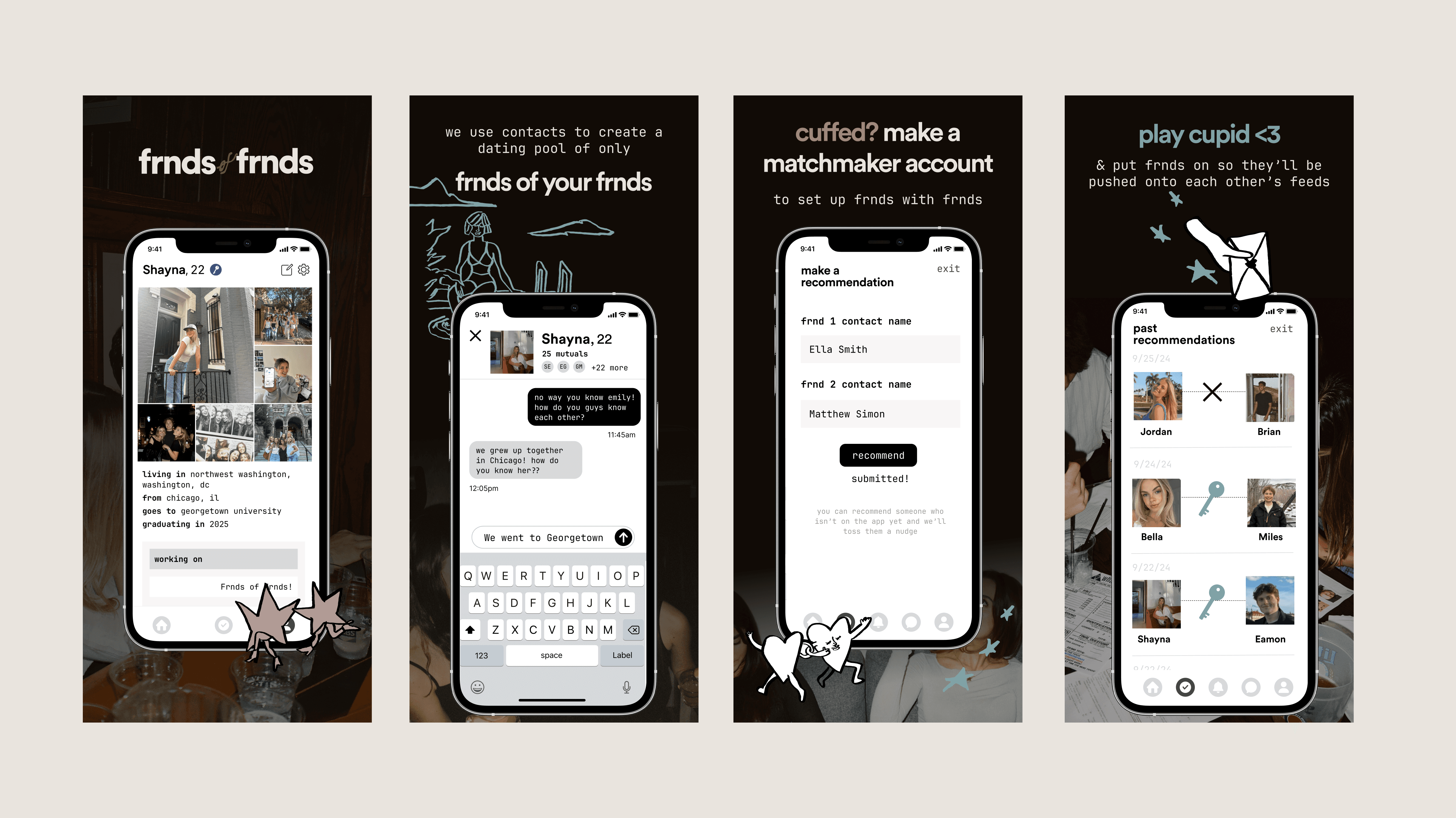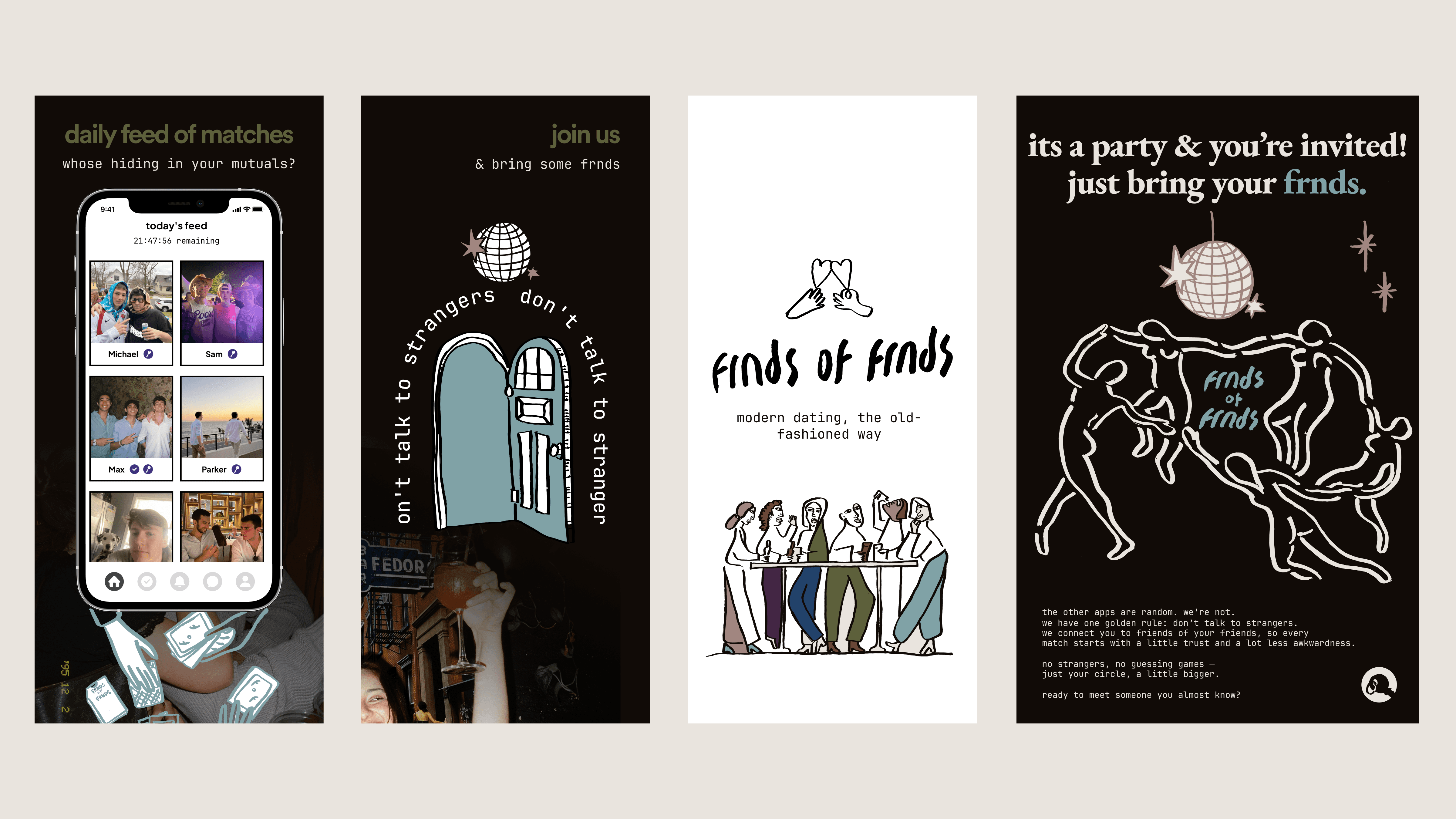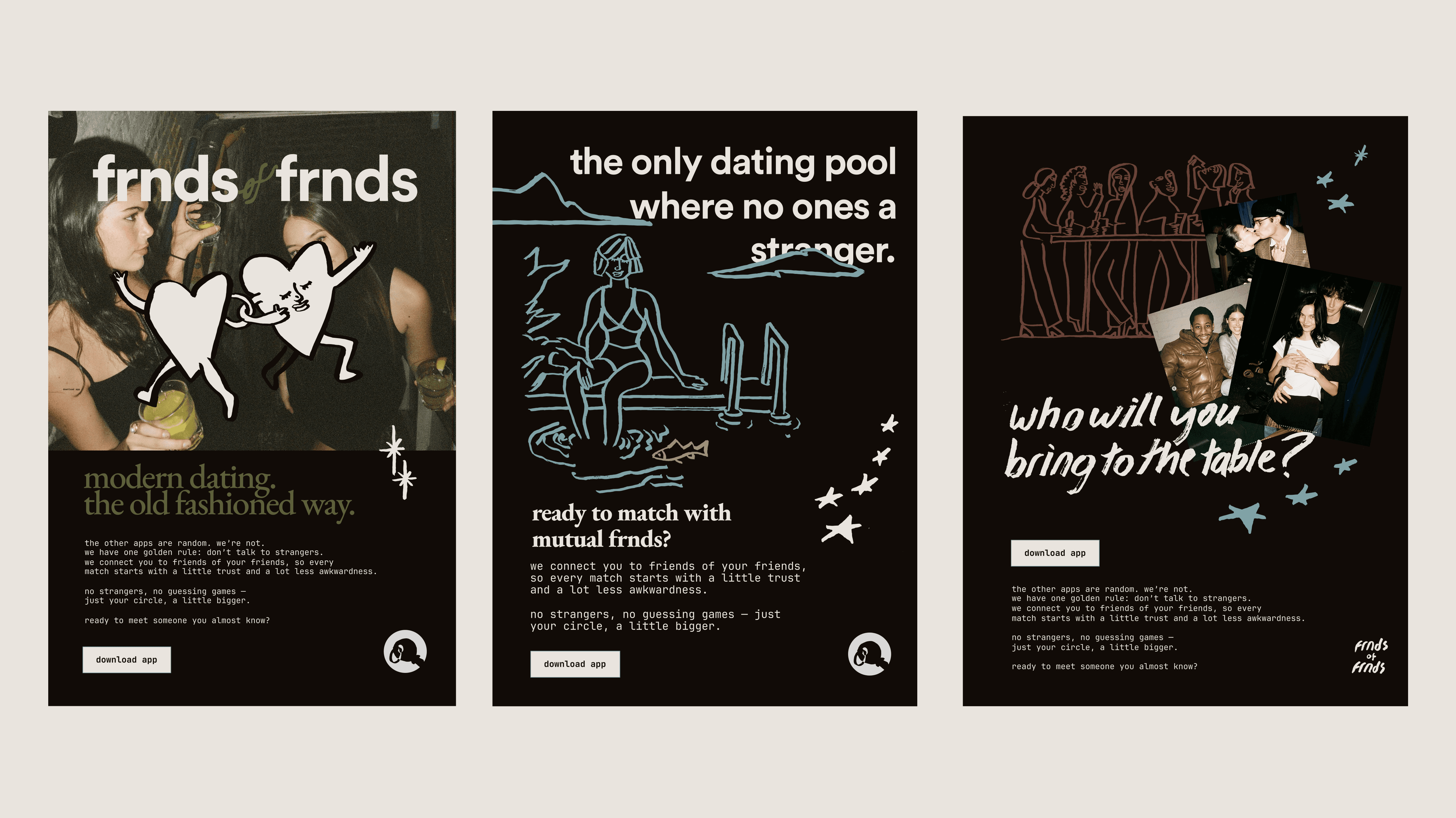 Reposition Frnds of Frnds as a trusted, design-forward dating platform built on real-world connections. The product needed to differentiate from swipe-based apps by emphasizing mutual relationships. The goal was to create a brand and product experience that felt credible, social, and effortless.
